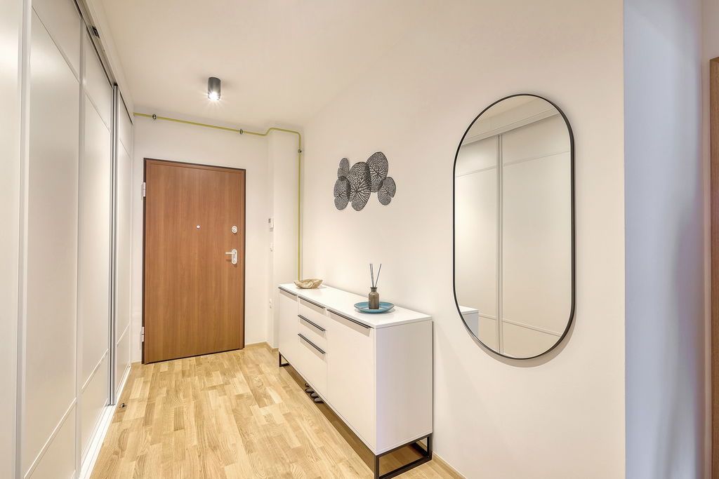 Stanovanje ima tudi veliko garderobnih omar in shranjevalnega prostora, kar omogoča praktično in urejeno bivanje.